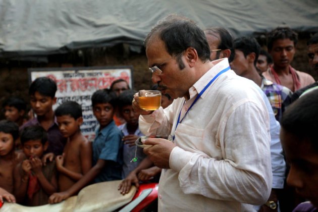 WBPCC President Adhir Chowdhury takes a tea break while voters cast their votes at Berhampore polling booth on Monday. ( Source: Express photo by Subham Dutta )