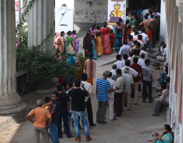 Voters stand in a queue to cast their votes at Berhampore on Monday. ( Source: Express photo by Subham Dutta )