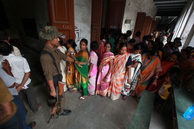 CRPF personnel instructs women voters to stand in a queue in Berhampore polling booth on Monday. ( Source: Express photo by Subham Dutta )