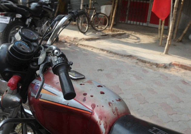 Blood stained motorbike of a CPIM supporters stands in front of party office at Beliaghata Cit road .The supporters were allegedly beaten by the TMC goons on Sunday. (Express photo: Partha Paul)