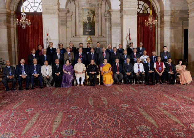 President Pranab Mukherjee, Prime Minister Narendra Modi and HRD Minister Smriti Irani at group photo session with Chairmen, Board of Governors and Directors of Indian Institute of Technology during a conference at Rashtrapati Bhavan in New Delhi on Friday. (Source: PTI)