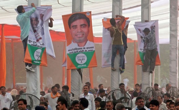 Youths removing the flex after Prime Minister of India Narendra Modi's election campaign rally in Karnal. (Source: Express photo by Kamleshwar Singh)