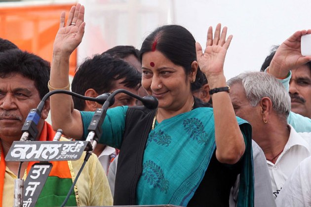 Sushma Swaraj addressing an election campaign rally in Kalka, Haryana. (Source: Express photo by Jaipal Singh)