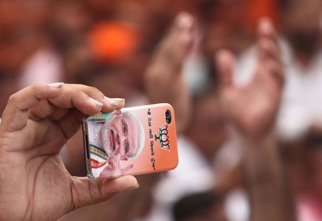 One of the supporters of BJP and PM Modi trying to take a picture at the election campaign rally in Karnal on Saturday. (Source: Express Photo by Kamleshwar Singh)