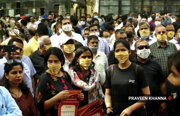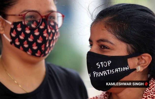 One of the employees of Public Sector Banks wore a mask with a message against privatization at Bank Square in Sector 17 Chandigarh on Tuesday. (Express Photo by Kamleshwar Singh)