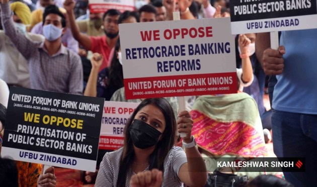 In a statement, the Centre of Indian Trade Unions (CITU) congratulated the participating employees and officers across the country for protesting "against the BJP government's moves to privatise public sector banks". (Express Photo by Kamleshwar Singh)