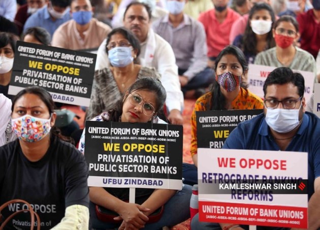 Employees of Public Sector Banks (PSUs) protesting at Bank Square in Sector 17 Chandigarh on Tuesday against privatisation. The two-day nationwide strike by the public sector bank (PSB) unions ended today with disruption in services like cash withdrawals, deposits, cheque clearances, remittances and loan approvals hitting customers. (Express Photo by Kamleshwar Singh)