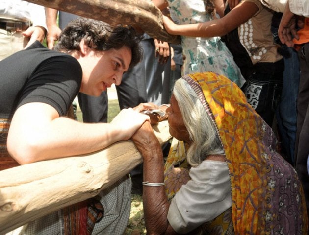 Priyanka Vadra talks with a woman during the election campaign. (PTI)