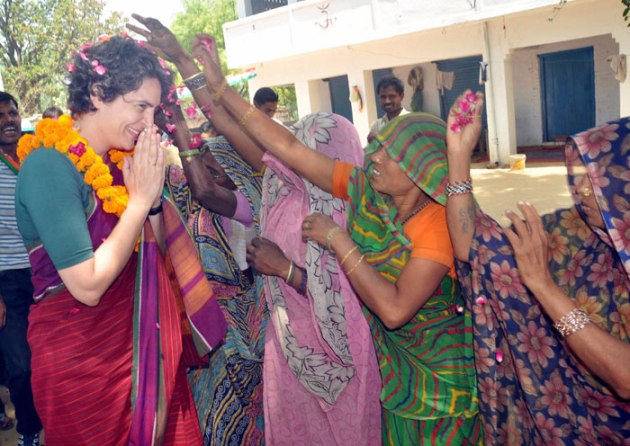 Priyanka Vadra is greeted by women during her election campaign for her mother and Congress President Sonia Gandhi in Raebareli on Wednesday. (PTI)