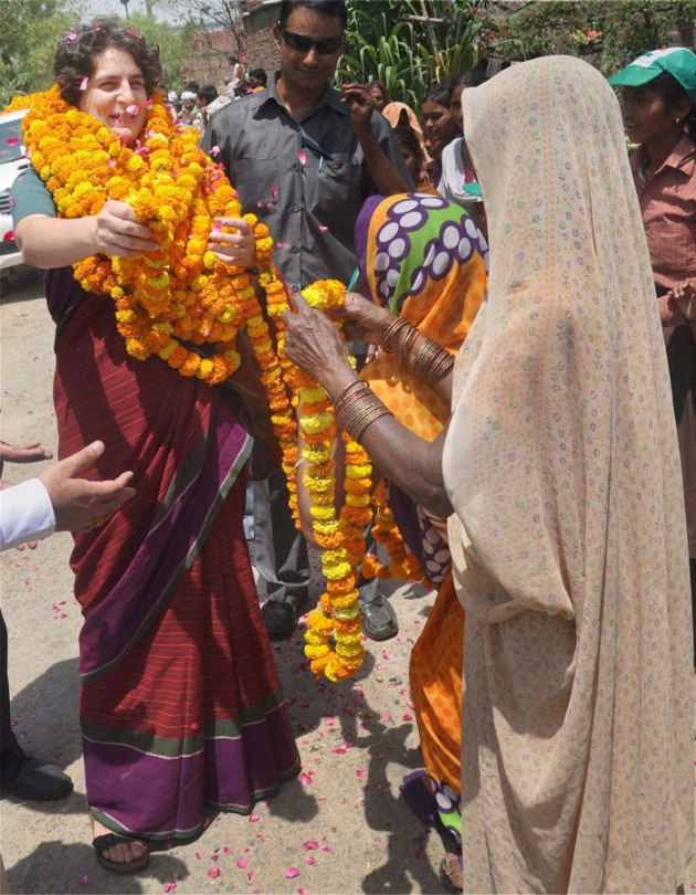 Priyanka Vadra is garlanded during an election campaign for her mother in Rae Bareli. (PTI)