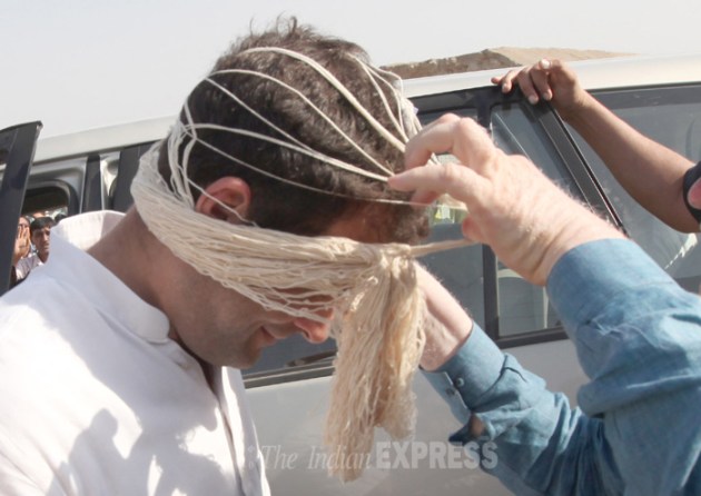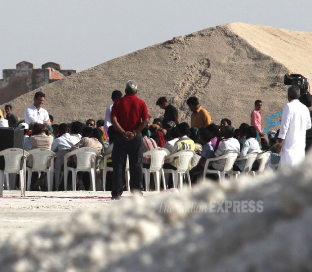 Later, Rahul met and interacted with salt pan workers, locally known as agariyas, at Kharaghoda in Surendranagar district, bordering the Little Rann of Kutch. Rahul listened to their problems and said, “I have understood your problems and I will try my best to address those issues. I am not saying that I will change your life in the next ten days, but I will make attempts.” State Congress leaders, including state party president Arjun Modhwadia, the Leader of the Opposition in the state Assembly Shankersinh Vaghela and UPA ministers Dinsha Patel and Bharatsinh Solanki also addressed the rally. (IE Photo: Javed Raja)