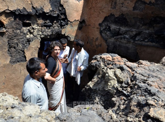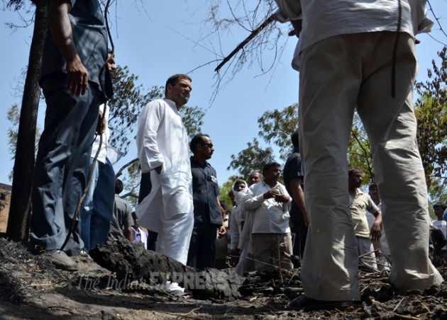Meanwhile, Rahul and Priyanka, along with their team, visited burnt huts. “Rahul ji yahan aa kar dekhiye,” said a 60- year-old Raj Kali and took Rahul to her hut. “My son’s marriage is on June 20 and his ‘tilak’ was scheduled for June 11. Who will give his daughter to a homeless now,” said Rajkali in tears. (Source: Express photo by Pramod Singh)