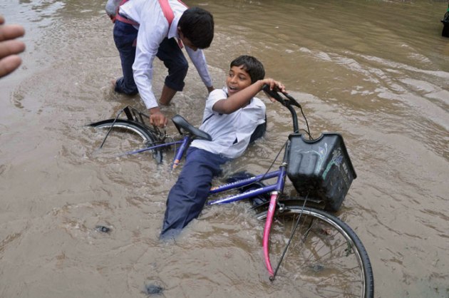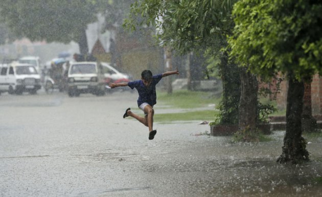 A boy plays in a waterlogged street in Allahabad on Friday. (Source: AP)