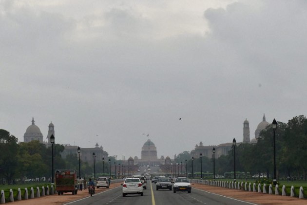 Vehicles plying on the Rajpath as monsoon clouds hover in the sky, in New Delhi on Friday. (Source: PTI)