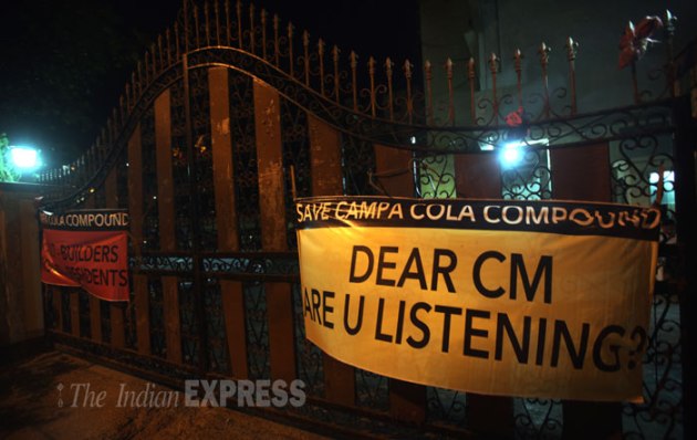 Banners saying “Save Campa Cola Compound” are seen hanging on the gates of Campa Cola in Mumbai on Thursday. (Source: Express photo by Pradip Das)