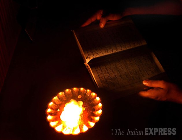 A person is seen reading the holy Quran in candle light as the basic amenities such as electricity and water supply were cut off for the illegal flats of the Campa Cola Compound. (Source: Express photo by Pradip Das)