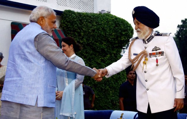 Prime Minister Narendra Modi shakes hands with Marshal of the IAF Arjan Singh at the 'At Home' hosted on the occasion of 82nd Anniversary of Indian Air Force at Air House in New Delhi on Wednesday. (Source: PTI)