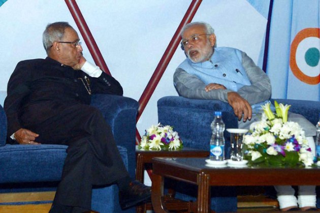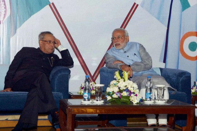 President Pranab Mukherjee and Prime Minister Narendra Modi attending the 'At Home' hosted by the Chief of the Air Staff on the occasion of 82nd Anniversary of Indian Air Force at Air House in New Delhi on Wednesday. (Source: PTI)