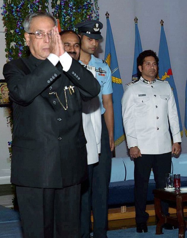 President Pranab Mukherjee with Chief of the Air Staff Arup Raha and cricket legend Sachin Tendulkar, honorary Group Captain, at the 'At Home' hosted on the occasion of 82nd Anniversary of Indian Air Force at Air House in New Delhi on Wednesday. (Source: PTI)