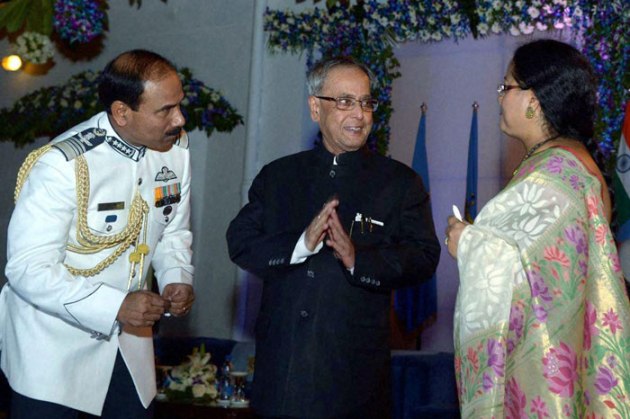 President Pranab Mukherjee with Chief of the Air Staff Arup Raha (L) and his wife at the 'At Home' hosted on the occasion of 82nd Anniversary of Indian Air Force at Air House in New Delhi on Wednesday. (Source: PTI)