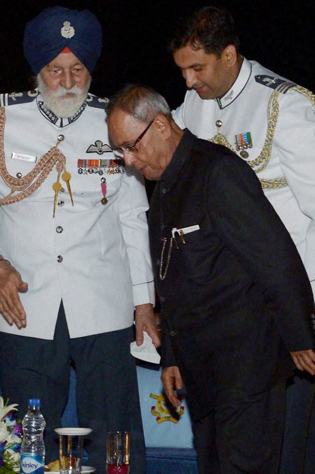 President Pranab Mukherjee with Marshal of the IAF Arjan Singh at the 'At Home' hosted on the occasion of 82nd Anniversary of Indian Air Force at Air House in New Delhi on Wednesday. (Source: PTI)
