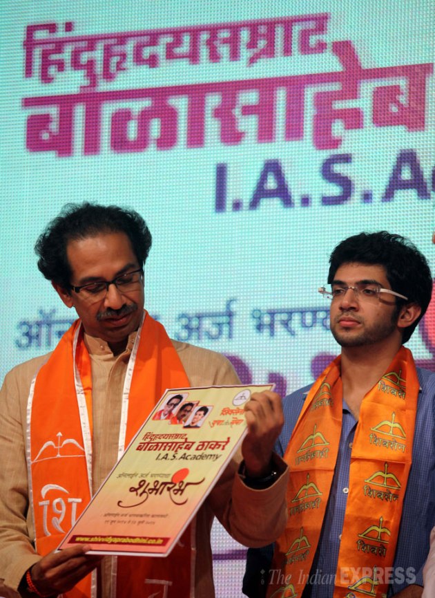 Shiv Sena Executive president Uddhav Thackeray along with son Aditya at the 48th celebration of Party Foundation Day in Bandra on Thursday. (Source: Express photo by Prashant Nadkar)