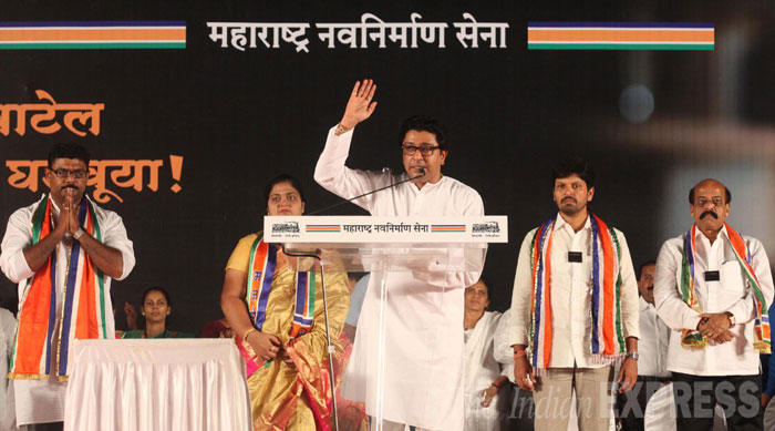 Raj Thackeray addresses the audience while the party workers look on. (Source: Express photo by Deepak Joshi)