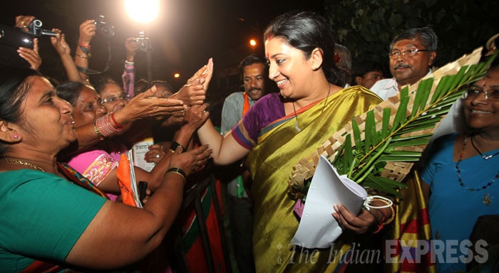 BJP workers welcome Smriti Irani during the election rally. (Source: Express photo by Prashant Nadkar)