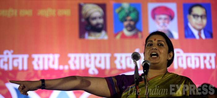 Ahead of the Assembly polls, HRD Minister Smriti Irani addressed a public meeting for BJP candidates in Kolhapur on Wednesday (October 8). (Source: Express photo by Prashant Nadkar)