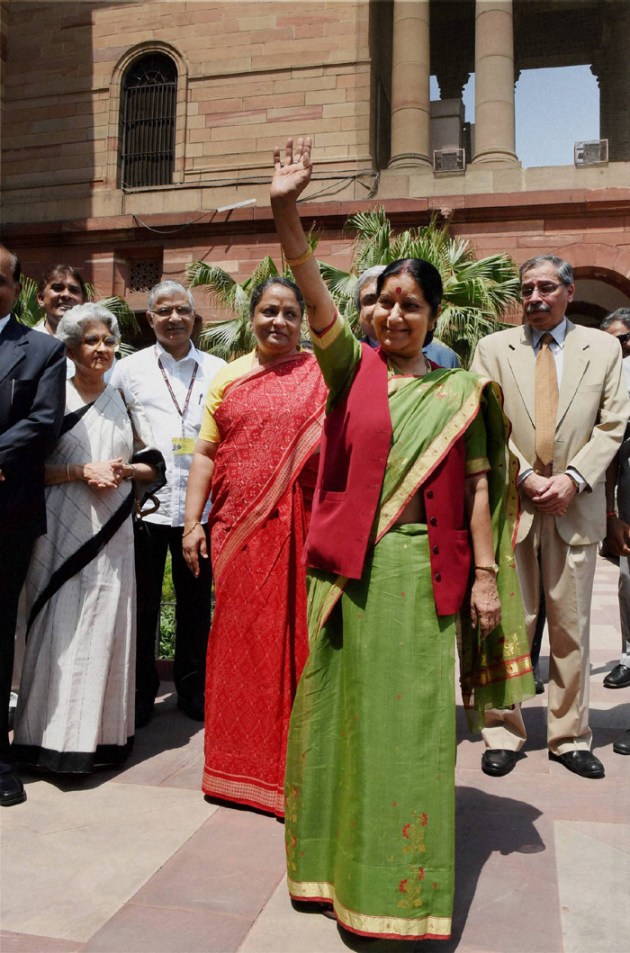 Sushma Swaraj arrives for taking charge as the Minister of External Affairs at South Block in New Delhi. (Source: PTI)