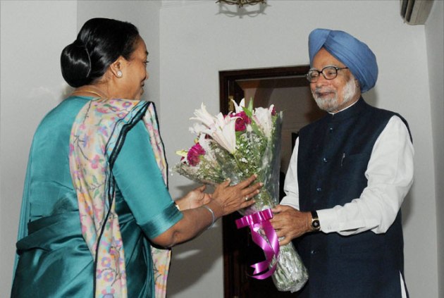 Lok Sabha Speaker Meira Kumar greets Prime Minister Manmohan Singh at his residence in New Delhi on Saturday. (PTI)