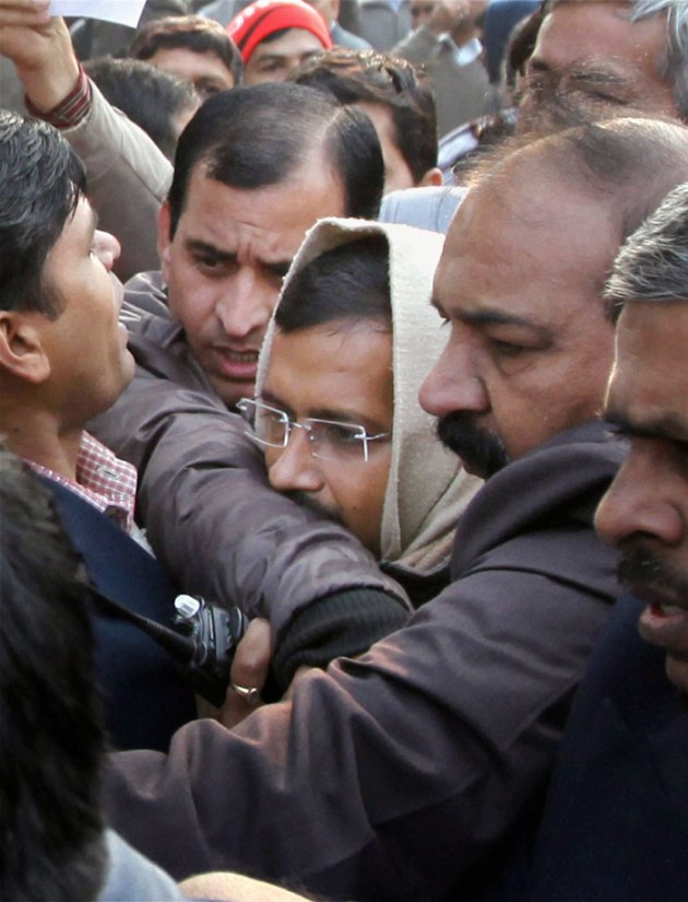 Delhi Chief Minister Arvind Kejriwal is escorted away by officials after a chaos during his inaugural 'Janata Darbar' or public hearing at Delhi Secretariat in New Delhi on Saturday. (PTI)