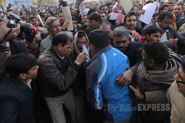 The Chief Minister was taken to his office by police personnel after the crowd at the public meet outside Delhi Secretariat went out of control. (IE Photo: Tashi Tobgyal)