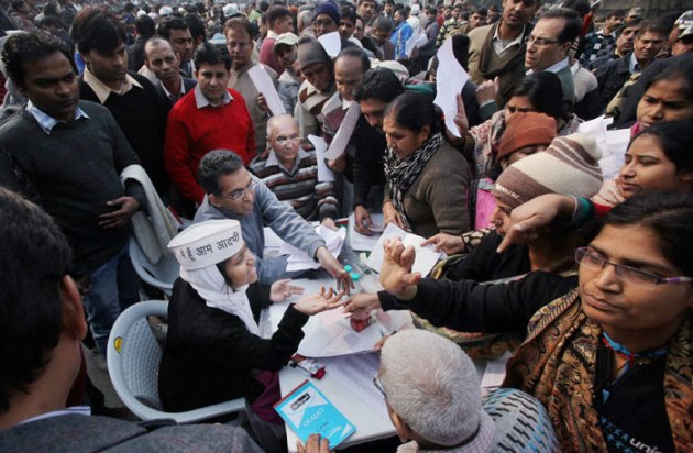 Delhi Chief Minister Arvind Kejriwal collecting papers regarding people's grievances during his inaugural 'Janata Darbar' or public hearing at Delhi Secretariat in New Delhi on Saturday. (PTI)