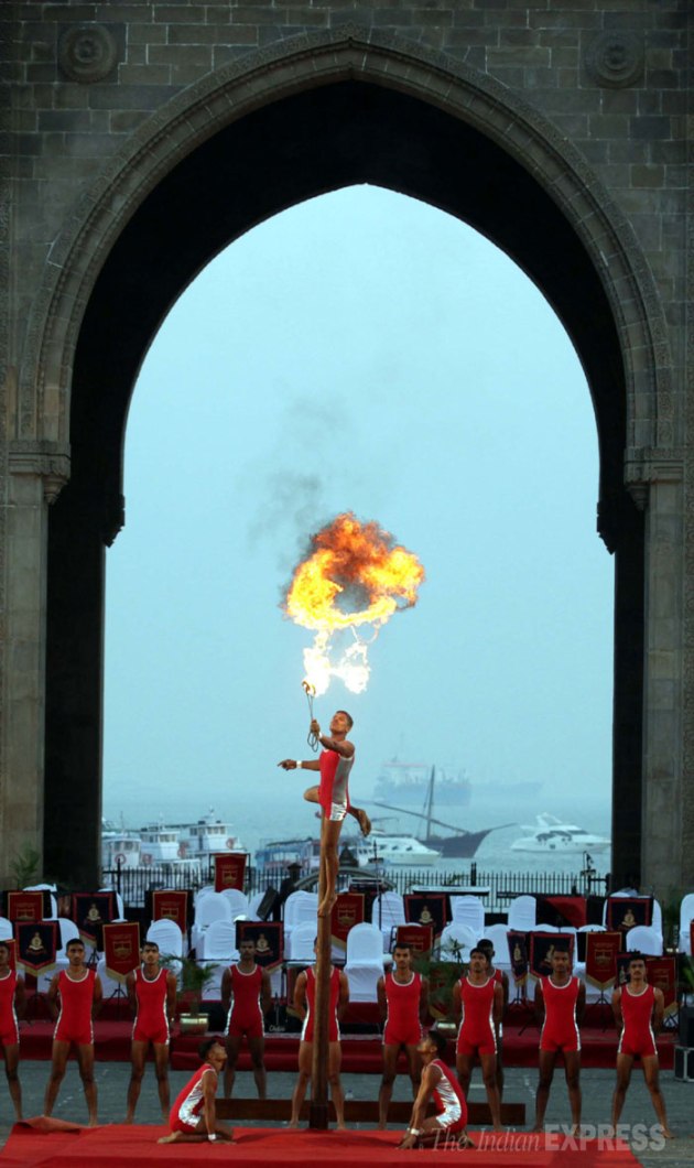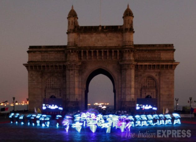 With Gateway of India in the background, the Southern Command put a brilliant military band display in LED lights with members of various units. (IE photo: Ganesh Shirsekar)
