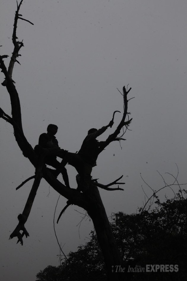 Children cut tree brunches for a bonfire in Chandigarh. (IE Photo: Jasbir Malhi)