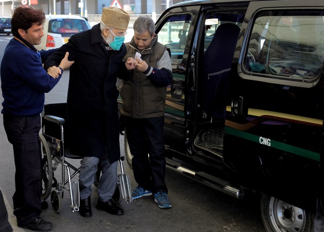 Hurriyat chairman Syed Ali Shah Geelani arrives at IGI airport in New Delhi, for his treatment in Medanta hospital, Gurgaon on Thursday. (IE Photo: Ravi Kanojia)