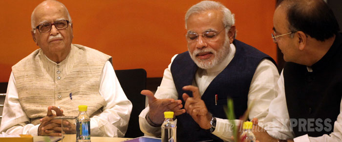 Senior BJP leader LK Advani and party's Prime Ministerial candidate Narendra Modi during party's Central Election Committee (CEC) meeting in New Delhi on Thursday. (IE Photo: Oinam Anand)