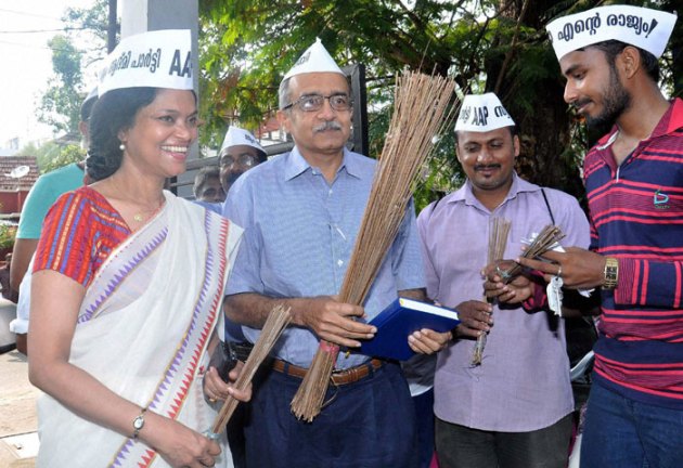 AAP candidate Anita Pratap with AAP leader Prashant Bhushan at an election campaign meeting in Kochi on Sunday. (PTI)