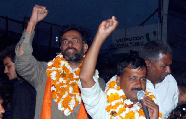AAP convener Arvind Kejriwal and its Gurgaon parliamentary candidate Yogendra Yadav during a road show in Gurgaon on Sunday. (PTI)