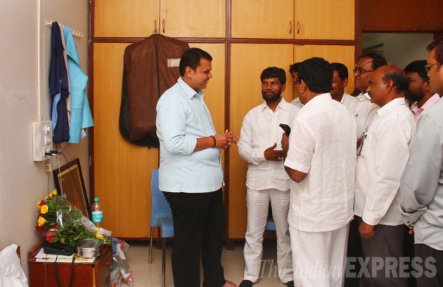 Devendra Fadnavis meets newly elected MLAs and BJP workers who came to congratulate him at Majestic - MLA Hostel. (Source: Express Photo by Amit Chakravarty)