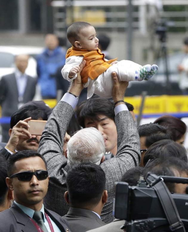 May 19, 2015: Prime Minister Narendra Modi, center, lifts an Indian baby in South Korea as he visited the Cheonggye stream in Seoul, South Korea on Tuesday. Modi is in the country to discuss economic ties and boost bilateral cooperation. (Source: AP)