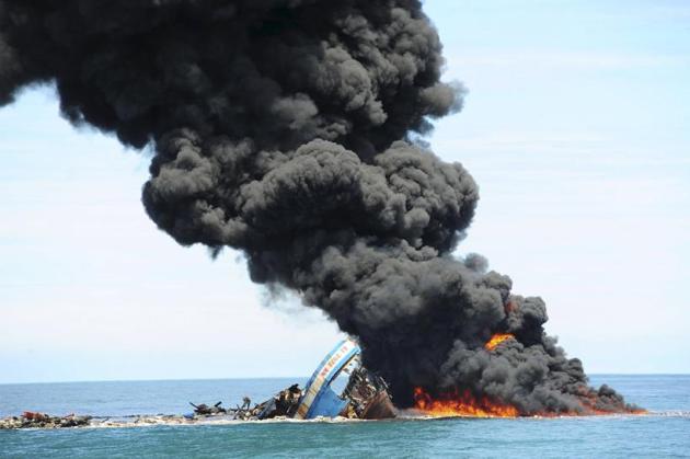 Four of eight confiscated Vietnamese fishing boats are destroyed in Mempawah Regency, West Kalimantan, Indonesia February 22, 2016 in this photo taken by Antara Foto. The Ministry of Maritime Affairs and Fisheries, together with the Indonesian Navy, destroyed 30 foreign fishing vessels in different locations across the country, which were seized earlier for illegal fishing in Indonesian waters. (Source: Reuters)
