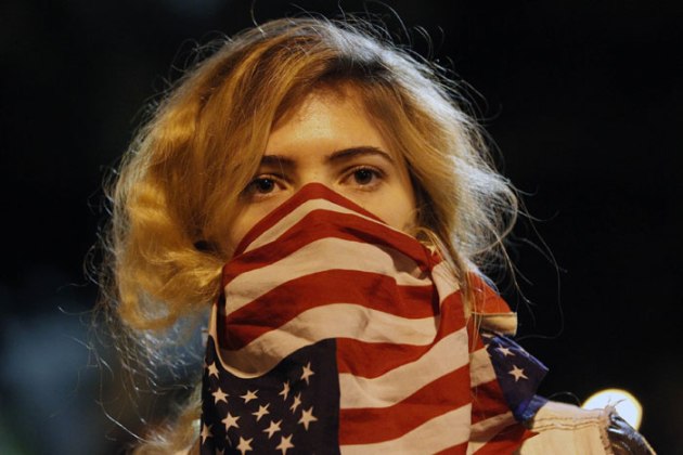 A woman wears a U.S. flag in front of her face during a rally near the Los Angeles Police Department headquarters in downtown Los Angeles on Tuesday, Nov. 25, 2014. People protesting the Ferguson Mo., grand jury decision took to the streets in cities across the U.S. for the second day. (Source: AP)