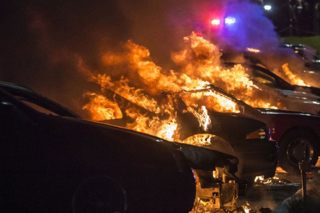 Vehicles at a car dealership are set afire in Ferguson, Missouri early morning November 25, 2014. Gunshots rang out and buildings burned in a Midwestern suburb after a grand jury decided on Monday not to indict a white police officer over the fatal August shooting of an unarmed black teenager, sparking a fresh wave of racially tinged violence. At least a dozen buildings were set on fire in Ferguson, Missouri, most of them left destroyed. (Source: Reuters)