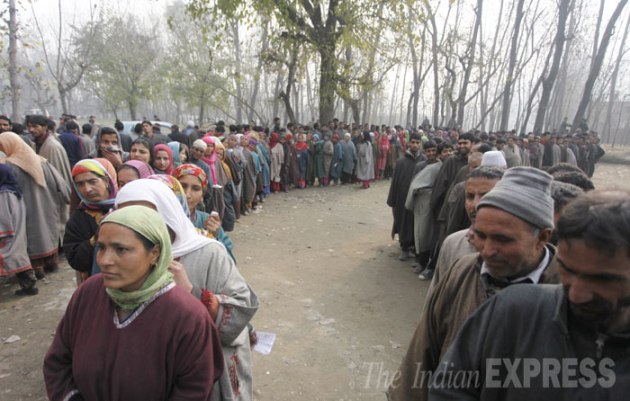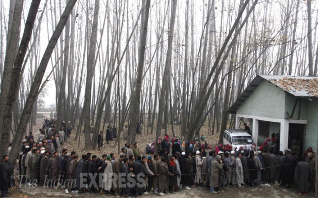 Kashmiri Muslims outside the polling station as they wait to cast their vote in Ganderbal on November 25. (Source: Express Photo by Shuaib Masoodi)
