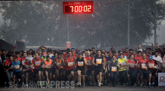 Participants on the start line during the Airtel Delhi half marathon in New Delhi on November 23, 2014. (Source: Express photo by Ravi Kanojia)