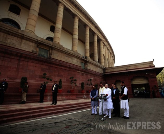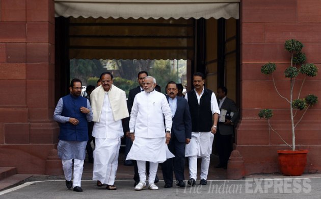 PM Modi with ministers Mukhtar Abbas Naqvi, Venkiah Naidu and Rajeev Pratap Rudy at the parliament. (Source: Express Photo by Neeraj Priyadarshi)