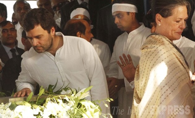 Sonia Gandhi and Rahul Gandhi at the last rites of Murli Deora at the Congress Office in New Delhi on November 24. (Source: Express photo by Pradeep Kocharekar)