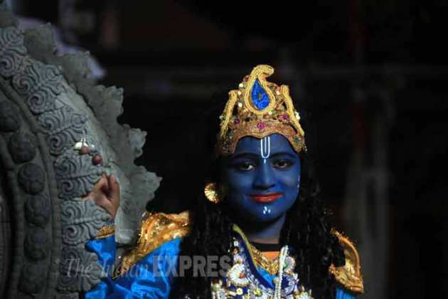 A girl dressd like Lord Krishna during the Gajon festival in Kolkata on Monday (April 20). (Express Photo By Partha Paul)